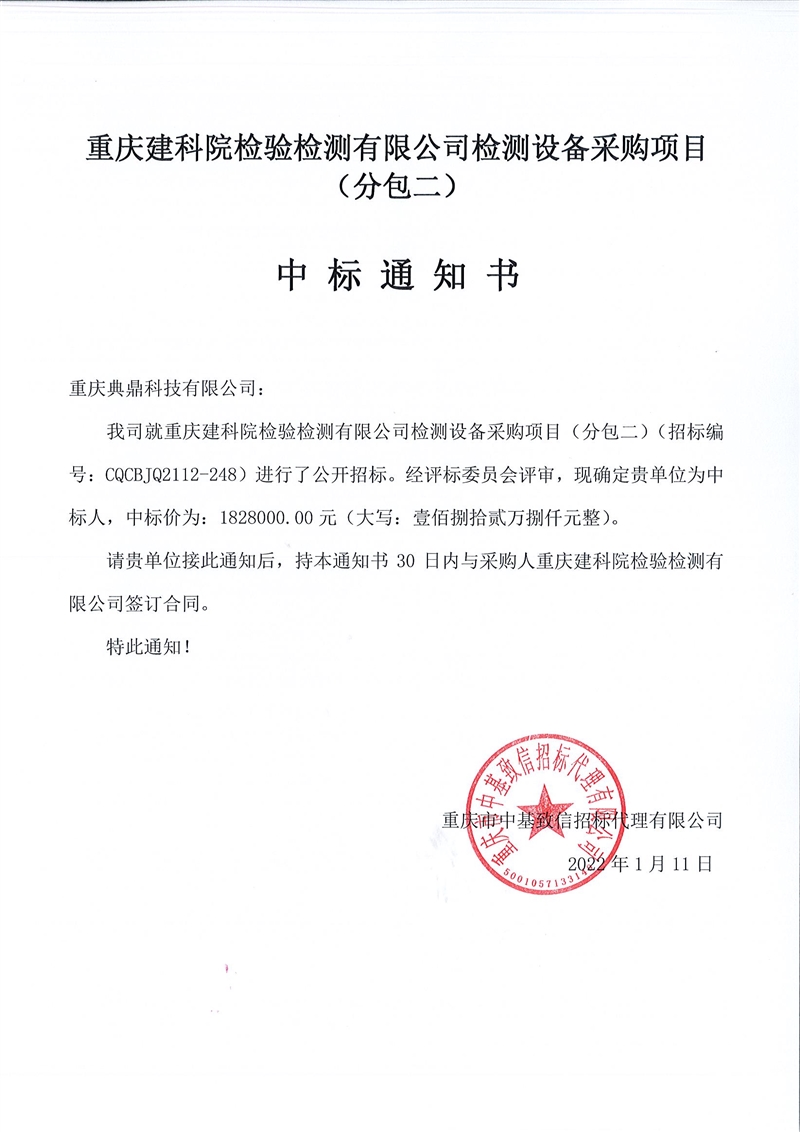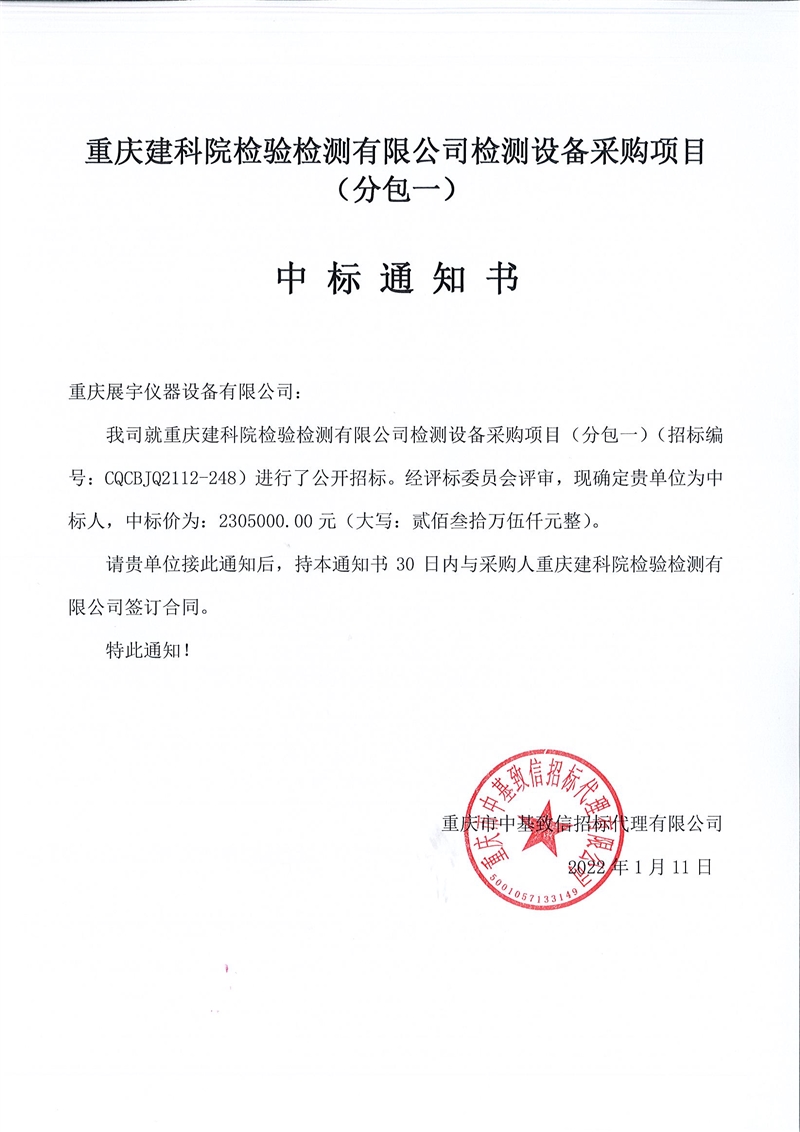 重慶建科院檢驗(yàn)檢測(cè)有限公司委托重慶市中基致信招標(biāo)代理有限公司對(duì)我公司檢測(cè)設(shè)備采購項(xiàng)目(項(xiàng)目號(hào):CQCBJQ2112-248 )分包一(力學(xué))和分包二(化學(xué))進(jìn)行了公開招標(biāo)采購,現(xiàn)已完成全部采購程序。確認(rèn)重慶展宇儀器設(shè)備有限公司為分包一(力學(xué))中標(biāo)人,中標(biāo)價(jià)為2305000元(貳佰參拾萬伍仟佰元整)。確認(rèn)重慶典鼎科技有限公司為分包二(化學(xué))中標(biāo)人,中標(biāo)價(jià)為1828000元(壹佰捌拾貳萬捌仟元整)。