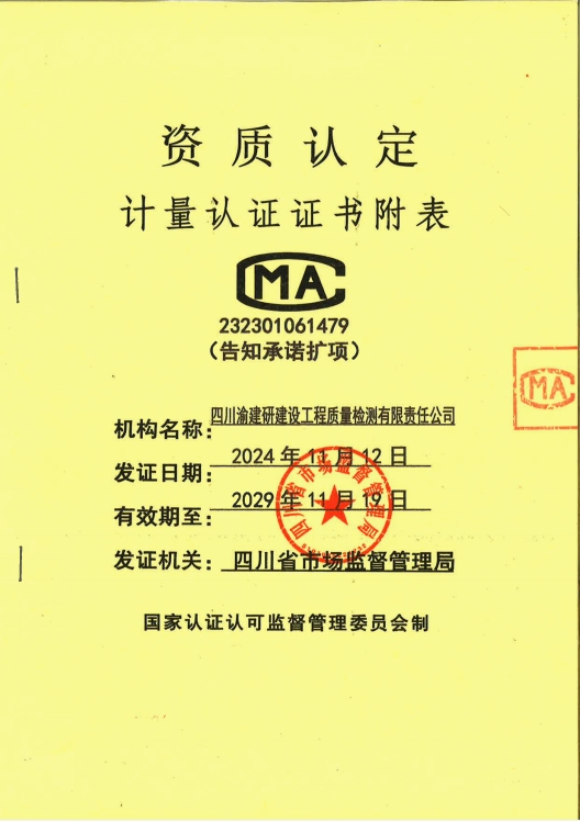 近日,重慶設(shè)計(jì)集團(tuán)市建科院公司所屬子企業(yè)四川渝建研建設(shè)工程質(zhì)量檢測(cè)有限責(zé)任公司(簡(jiǎn)稱(chēng)“四川渝建研公司”)在檢測(cè)技術(shù)領(lǐng)域取得重大突破,CMA(檢驗(yàn)檢測(cè)機(jī)構(gòu)資質(zhì)認(rèn)定)資質(zhì)參數(shù)由566項(xiàng)成功擴(kuò)增至1132項(xiàng),公司檢測(cè)資質(zhì)范圍由原先的“四大類(lèi)”增至“八大類(lèi)”,擴(kuò)項(xiàng)后公司檢測(cè)技術(shù)能力再上新臺(tái)階,滿(mǎn)足了水利工程檢測(cè)資質(zhì)必須參數(shù)需求,位居四川省檢測(cè)機(jī)構(gòu)中上游水平。